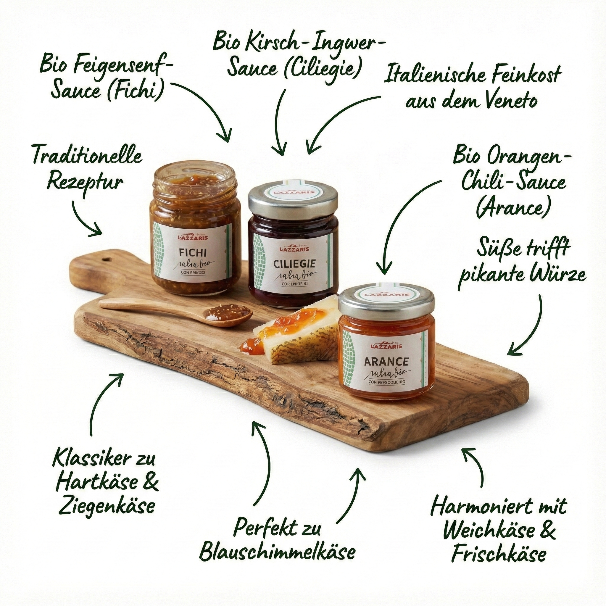 Ein italienisches Trio für den vollendeten Käsegenuss Wer Käse liebt, weiß: Der richtige Begleiter hebt den Genuss auf eine ganz neue Ebene. Mit dem Käse-Saucen Trio von Lazzaris holen Sie sich ein Stück venezianische Tradition direkt auf die Käseplatte. Hergestellt im Herzen des Veneto, in Conegliano, steht der Name Lazzaris seit Anfang des 20. Jahrhunderts für die Kunst, Früchte mit Senf und Gewürzen zu veredeln. Das Trio hat je 40g also zusammen 120g.